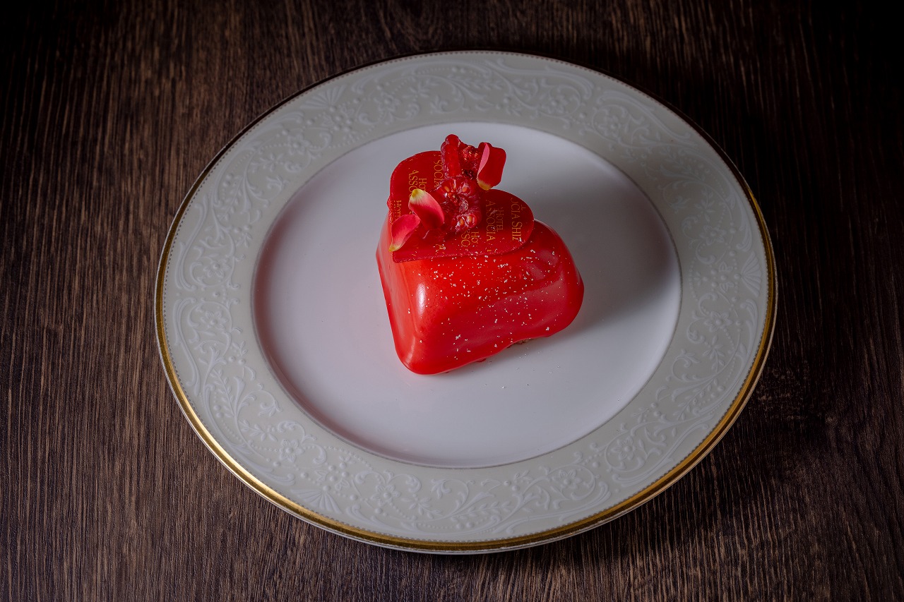 ミルクとルビーの2種類のチョコレートを合わせたムースを、ラズベリームースに包み込んだハートのケーキ。 ピスタチオ香るサブレフレークの食感もお楽しみいただけます。 食べるのがもったいないくらいの綺麗なケーキです。 |