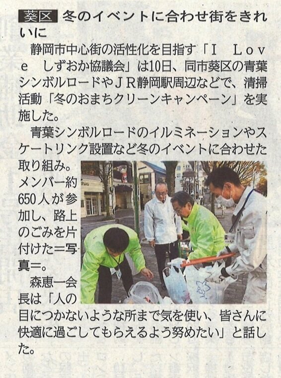今回のクリーンキャンペーンは、2015年11月20日からの青葉イルミネーションを皮切りに、来年1月31日まで開催する「しずおか“おまち”でWinter Festival2015 -2016」の期間中に、来街者が美しい環境で快適にクリスマスムード高まる「おまち」を楽しんでいただけるよう中心市街地の清掃美化活動を実施いたしました。