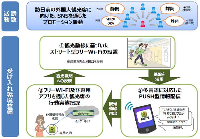 NTTグループが提供するフリーWi-Fiとスマートフォン/タブレット向け専用アプリケーション(以下、専用アプリ)を活用して、静岡市内初となるICTを活用した各種取り組みを実施し、静岡市における観光ソリューションの有効性等に関する検証を行います。