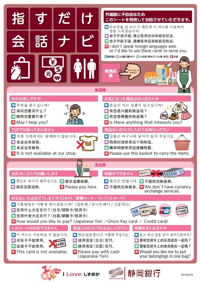 “おまち”にも外国人観光客が多く訪れることを受け、当協議会の正会員である静岡銀行と協力し、販売店や宿泊施設等の従業員がシートを指さすだけでコミュニケーションが取りやすくなる「指すだけ会話ナビ(I Loveしずおか協議会Ver.)」を作成しました。