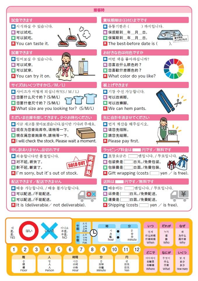 種類は「販売店編」「飲食店編」「宿泊施設編」「タクシー編」の計4種で、中国語(簡体字・繁体字)、韓国語、英語に対応しています。