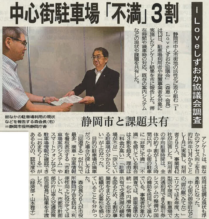2016年7月13日(水)、昨年度に実施した「静岡中心市街地街なかアクセス向上に関するアンケート調査結果(駐車場事業者・利用者対象)」を、今後の静岡市の政策等に役立てていただくため、静岡市に情報提供しました。