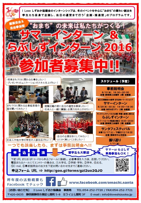 A2:体験型のインターンシップであるため、企画・運営準備・広報等、当日までのプロセスが非常に大切になってきます。せっかく事前準備に携わっていただくのに本番日に出られないのは残念ですが、ラブしずインターンにはご参加いただけます。 |