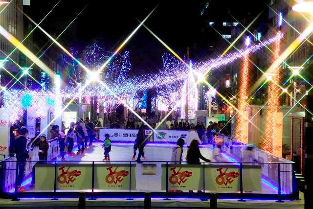 17:00から19:00までは、イルミネーションがきらめく中、スケートを楽しめます。