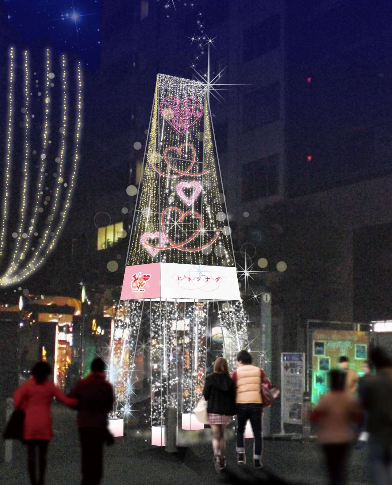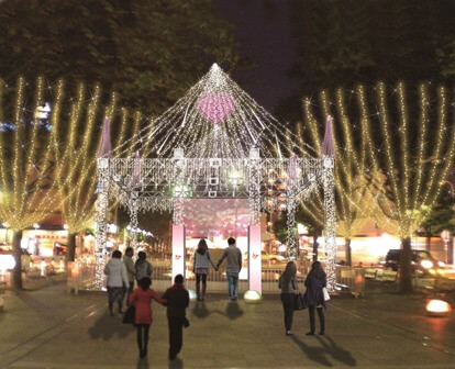 ドレープ状のシャンパンゴールドの光が散りばめられた並木道を通ると、ハートが光り輝くツリーや、高さ10mのシンボルモニュメントが来場者を出迎えてくれます。