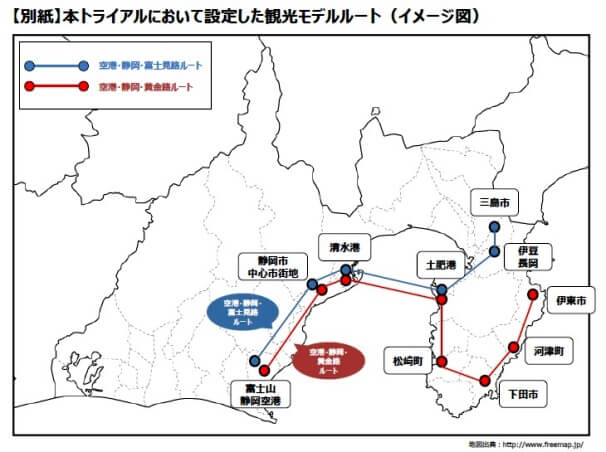 実施内容 | 富士山静岡空港から伊豆半島にかけてモデルルートを設定し(別紙)、モデルルート上におけるICTによる周遊・消費・情報発信促進の効果を測定します。 |