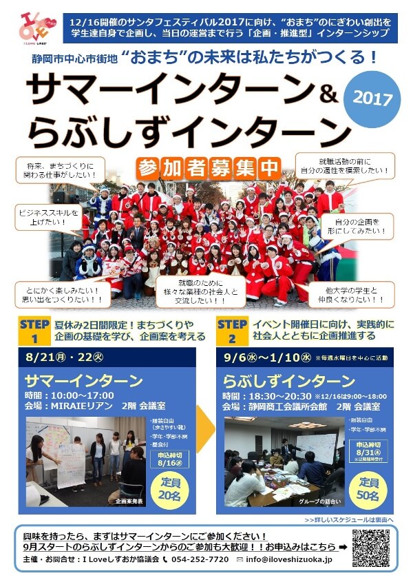 「サンタフェスティバル2017」に向け、“おまち”のにぎわい創出を学生たち自身で企画し、当日の運営まで行う企画・推進型のプログラム「らぶしずインターン」を前に、サマーインターンでは、8月の2日間、社会人やインターン経験者の指導のもと“おまち”の課題に取り組む座学やワークショップを行います。