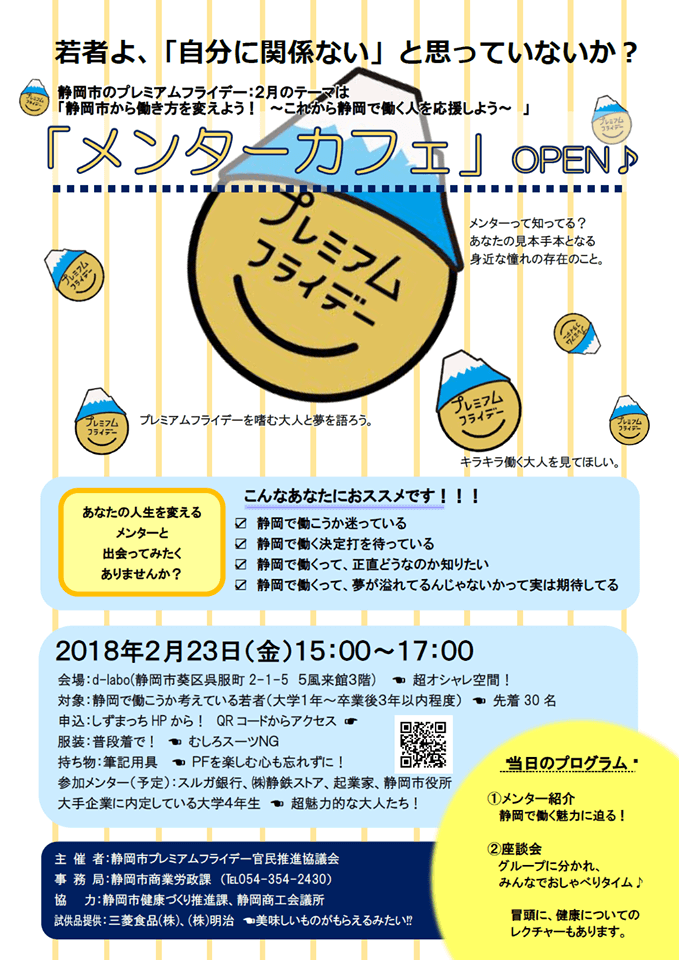 そして、2月16日には記念フォーラム、プレミアムフライデー前日の22日にはJR静岡駅にて「定時退茶飴」を配布、当日にはメンターカフェを開催いたします。お楽しみに!