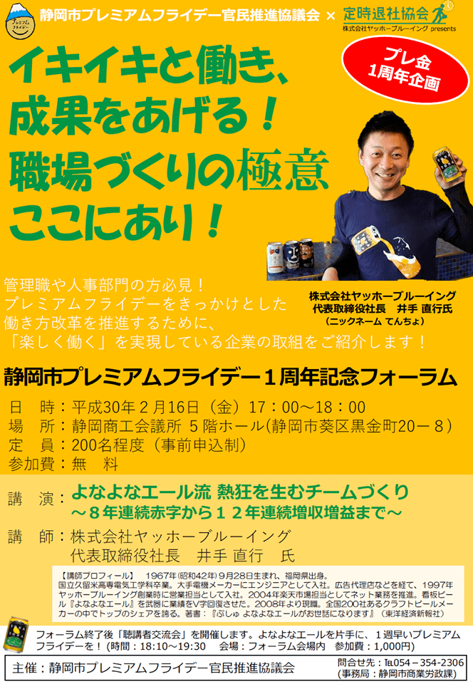 管理職や人事部門の方必見!プレミアムフライデーをきっかけとした働き方改革を推進するために、よなよなエールで有名なヤッホーブルーイングの井手直行社長をお招きし、「楽しく働く」を実現している取り組みをご紹介します!!