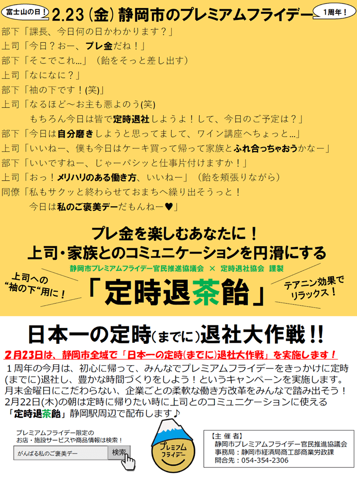 そして、2月16日には記念フォーラム、プレミアムフライデー前日の22日にはJR静岡駅にて「定時退茶飴」を配布、当日にはメンターカフェを開催いたします。お楽しみに!